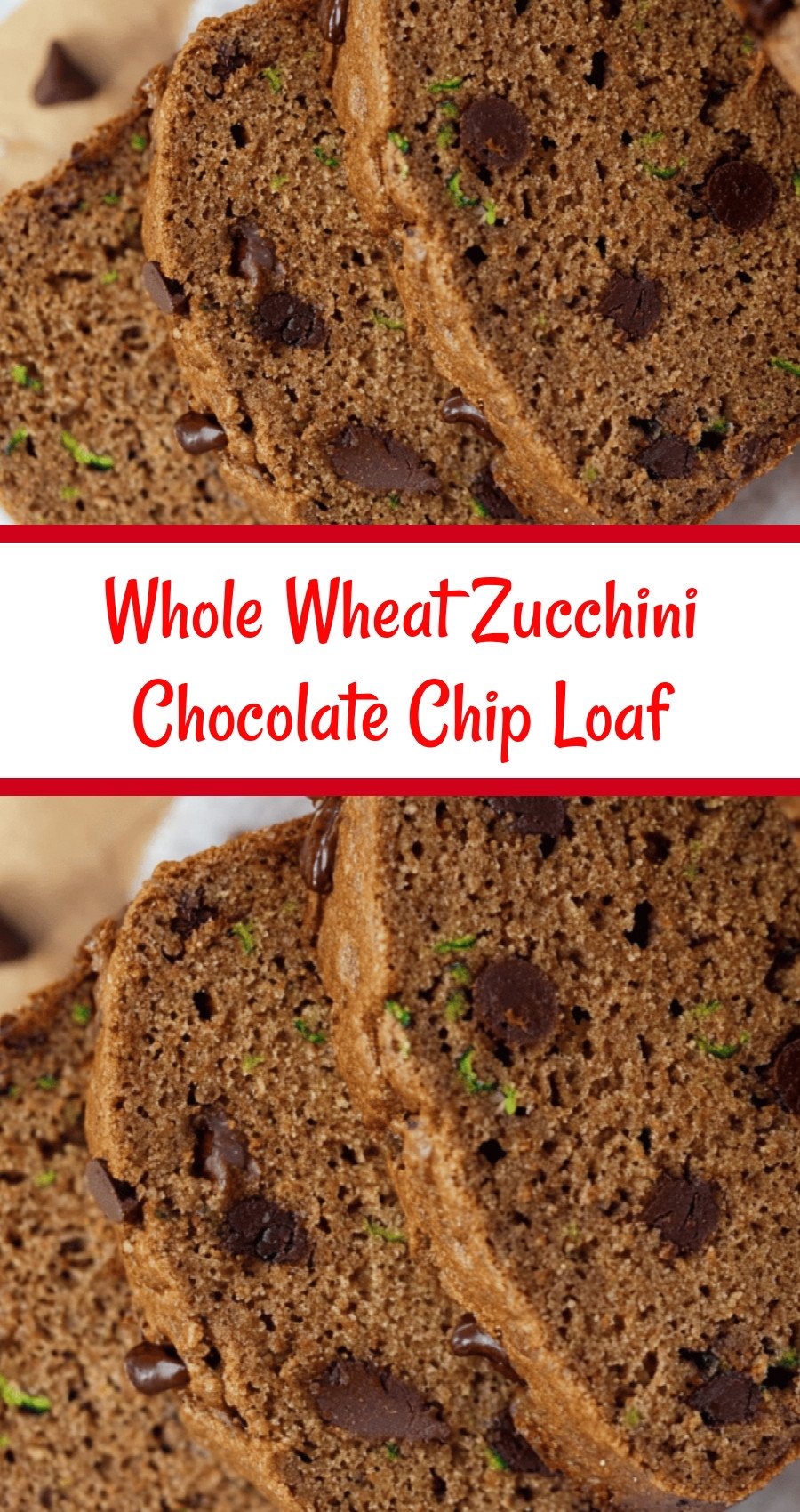 Indulge in this moist & healthy whole wheat zucchini chocolate chip loaf. The perfect easy snack or breakfast, secretly packed with veggies! #healthybaking healthy zucchini bread, whole wheat zucchini loaf, chocolate chip zucchini bread, easy zucchini recipe, healthy snack ideas